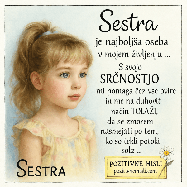 Samo ti mi daješ ljubav koja nema uslove. Sestra je oseba, ki jo imaš zelo rad.. Sestru ne može da zameni ni stotinu najboljih drugarica, jer ona će biti zauvek tu za vas.