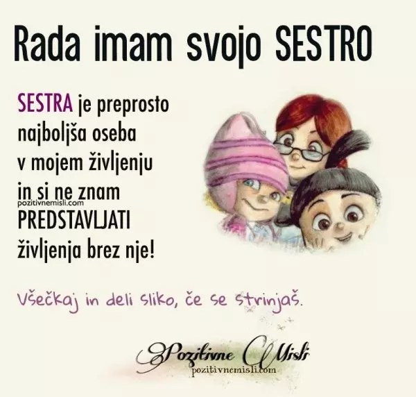 Moj brat je nekaj posebnega in si ne znam predstavljati življenja brez njega... Samo ti mi daješ ljubav koja nema uslove. Mar 29, 2019 · starija sestra je uvek tu da vam bude glavna podrška i snaga dok rastete i otkrivate sebe. Vas dvije i najdosadnija kišna nedjeljna popodneva znate da pretvorite u pravu zabavu samo zato što ste jedna uz drugu. Sestru ne može da zameni ni stotinu najboljih drugarica, jer ona će biti zauvek tu za vas. Sestra je oseba, ki jo imaš zelo rad.. Feb 03, 2018 · najljepši citati o sestrama.